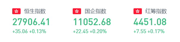 圣诞假期临近,港股周一交投低迷。截至收盘,恒生指数涨幅0.13%,收盘报27906.41点;国企指数涨0.20%,收盘报11052.68点;红筹指数涨0.17%,收盘报4451.08点。