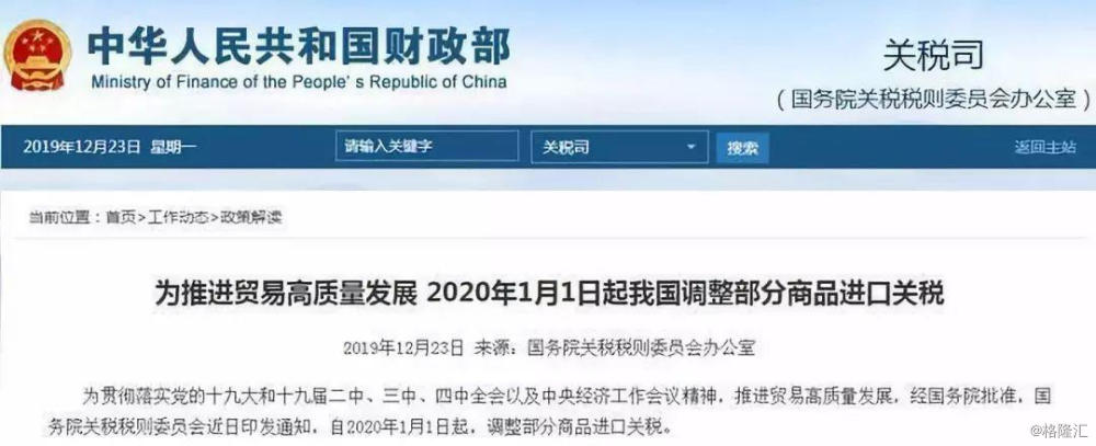国务院关税税则委员会:2020年1月1日起调整部分商品进口关税