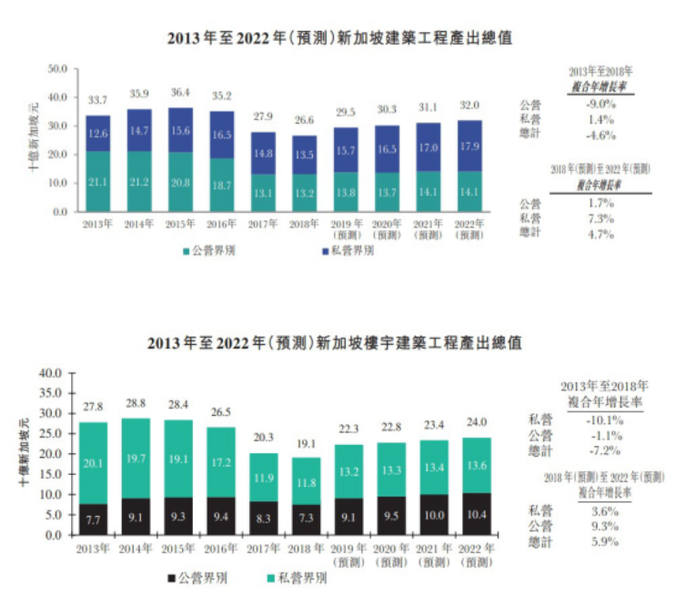 受公营及私营界别影响,楼房建筑工程产出总值由2013年的278亿新加坡元下跌至2018年的191亿新加坡元,概约复合年增长率为-7.2%。随着私人物业市场有望复苏,而且新加坡政府推出升级公营房屋及医疗设施的措施,预期新加坡楼宇建筑产出总值将由2018年的191亿新加坡元上升至2022年的240亿新加坡元。