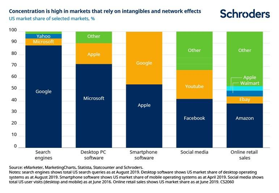 这些影响在IT部门尤为明显。例如,谷歌获得了美国所有互联网搜索活动的88%,Facebook控制了美国社交媒体的42%,几乎所有移动操作系统都是由苹果(iOS)或谷歌(Android)提供的。这些数字平台和产品的主导地位为竞争对手设置了强大的进入壁垒。