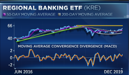 对于KRE来说,升至65美元意味着上涨11%。这也将使其接近66.04美元的歷史高点。