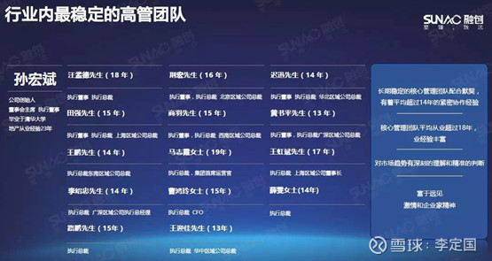 此外,R拥有一支业内罕见优秀稳定的管理队伍。R的管理团队是上市房企中高管和中层人才流失率最低的,上市至今高管团队全部留任,平均就职年份超过15年,中高层的流失率只有1%。这个以孙宏斌为核心的稳定、优秀团结的管理团队是R无形厚势的关键点。