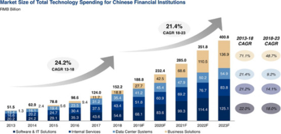 据奥维咨询估计,中国金融机构2018年在科技领域的开支总计1,522亿人民币,这一数字将以21.4%的年复合增长率增长,2023年将达到4,008亿人民币。