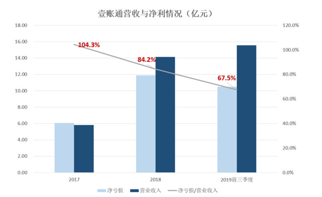 尽管收入持续增加,但壹账通依然处于持续亏损的状态。2017年、2018年和2019年前三季度,营收分别为5.82亿元、14.13亿元和15.55亿元;净亏损分别为6.07亿元、11.90亿元和10.49亿元,累计亏损为28.47亿元。