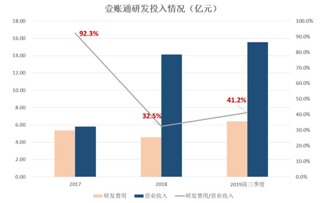 增收不增利主要是由于其居高不下的研发投入。2017~2019年9月30日,壹账通的研发费用分别为5.37亿元、4.59亿元和6.41亿元,与当年总营收的比值分别为92.3%、32.5%和41.2%。