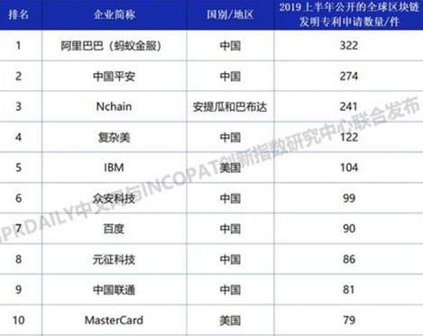 根据《2019上半年全球区块链企业发明专利排行榜》显示,排名靠前的有大量是中国企业,中国平安以274件专利排名第二。