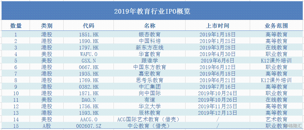 回溯2019年,算上分别在美股和A股借壳的ACG国际艺术教育和中公教育,教育行业全年度共计实现IPO15家,这个数量略微超过2018年的13家。单从数量上来看,今年教育公司IPO的情况还算比较乐观,并未如传闻中的遭遇寒冬,只是资源可能更加向行业的头部倾斜,包括职教龙头中国东方教育、在线教育龙头新东方在线、大湾区民办高校龙头中国科培、K12课外培训龙头思考乐教育等。