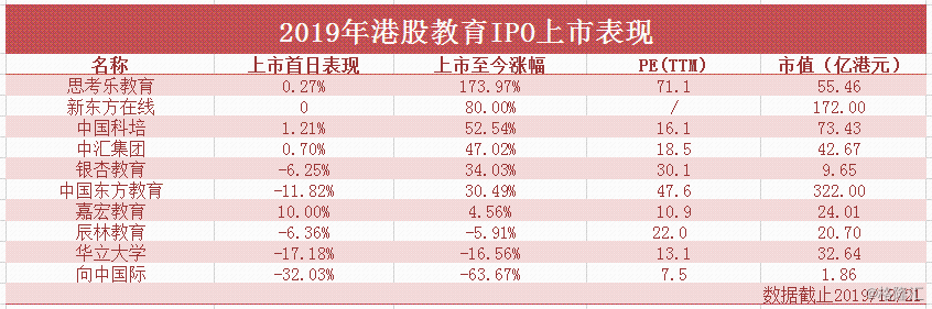 而在经历了2018年严格的政策规范后,教育行业的估值似乎也开始趋于冷静,目前港股的平均市盈率回归到近30倍。不过,这并不意味着教育市场IPO“遇冷”,相反的,回顾2019年教育行业的IPO情况,今年的教育新股无论从数量还是质量来说,都并不逊色于2018年。