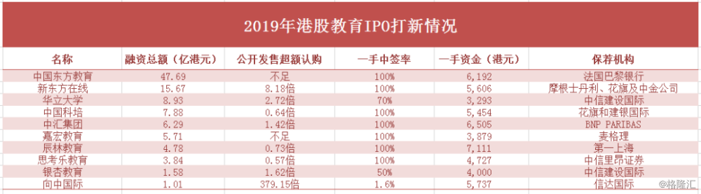 具体看港股教育板块的IPO打新情况。2019年截至目前,香港共有10只新上市的内地教育股,期内融资额最高的是中国东方教育,融资总额达到47.69亿港元,入场费为6,192港元,不过最终认购不足。相反,融资总额仅有1.01亿港元排名垫底的向中国际,公开发售超额认购却高达379.15倍,入场费5,737港元。