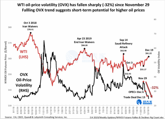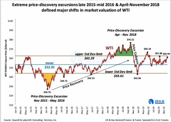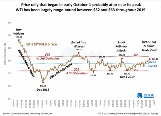 如下图所示,WTI原油价格在10月初从52.31美元的低点开始上涨,并于12月19日触及61.22美元。过去15个月WTI油价均值±一个标准差的价格为63美元和52美元。2019年每一次的反弹都是从距离52美元不到1美元的水平开始的,并结束于60美元区间的中低端——比平均价格高出约一个标准差。