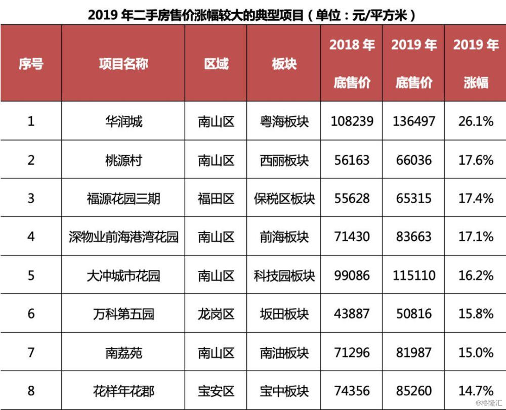 与之相比,深圳二手房售价更为市场化,2019年售价涨幅十分可观。据不完全统计显示,2019年深圳二手房售价大幅上涨,多项目全年涨幅超10%,更有项目涨幅接近30%。