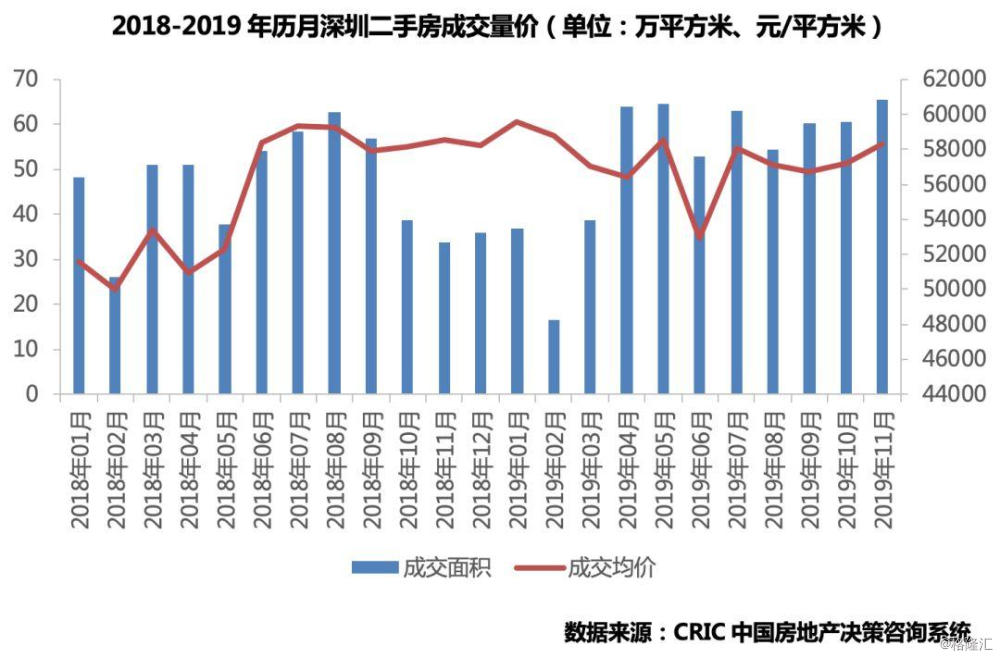 2019年,在新房市场显著升温的同时,深圳二手房市场也同步转暖,成交量价齐升。1-11月,深圳二手房累计成交577万平方米,同比增长11%;成交均价57217元/平方米,同比上涨3%。
