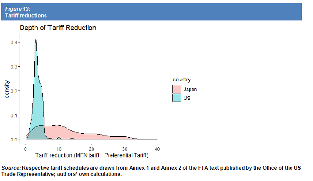 报告在测算该协议实现的自由化深度时发现,美日关税减让不对称,这反映了日本在双边谈判中的相对劣势地位。