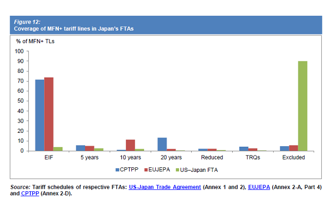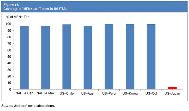 从覆盖范围而言,在日美贸易协定中,双方关税细目(TL)列出的条目很少。通常TL是衡量谈判各方实现自由化范围的有效指标。