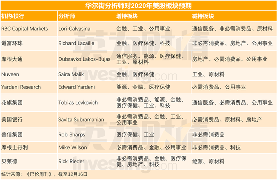 华尔街分析师对2020年美股板块预期