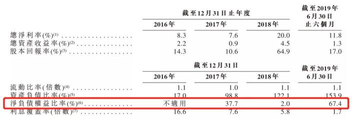 业绩高速增长的背后离不开资金的推动,港地地产近年的负债也是急剧增加。招股书显示2017年、2018年以及2019年上半年,港龙地产的净负债权益比率分别为37.7%、2.0%及67.4%。