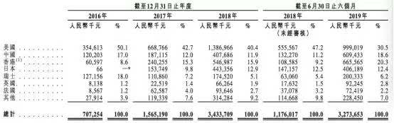 2016年-2019年6月,中国大陆客户所产生的收益占总收益的比重分别为17%、12%、11.9%以及18.6%。而美国客户所产生的收益占比分别为50.1%、42.7%、40.4%以及30.5%。