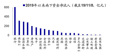 从“南下”资金行业配置偏好来看,2019年以来南下资金累计持股前五行业分别为银行、非银金融、地产、计算机、医药生物 。