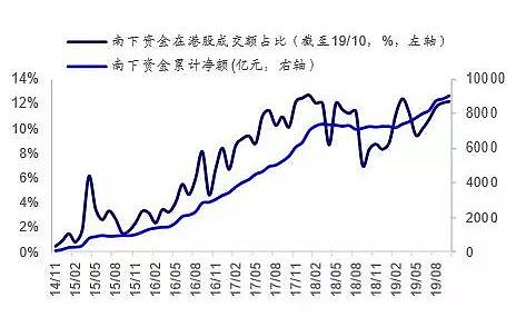 WIND数据显示,截至2019/12/18,港股通2019年以来累计净买入2357.35亿元人民币,仅次于2017年。自2014/11/17港股通开通以来,港股通累计买入成交净额达9596.81亿元人民币。据海通证券报告,截至2019年11月,南下资金在港股成交额占比达12.3%。