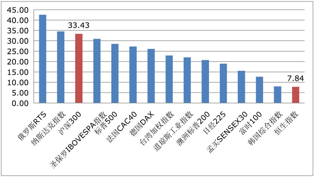 截至2019/12/20,在今年以来全球市场重要指数中,沪深300涨幅33.43%排名前三,恒生指数同期涨幅7.84%,落后于全球其他重要指数。