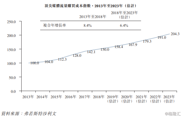 流量总量下滑后, 互联网广告位竞争加剧,获取优质广告流量的成本逐渐提升。顶尖媒体流量购买成本指数由2013年的100.0增加至2018年的150.0,复合年增长率为8.4%。未来预计将继续向上,移动广告的采购成本会持续上升。