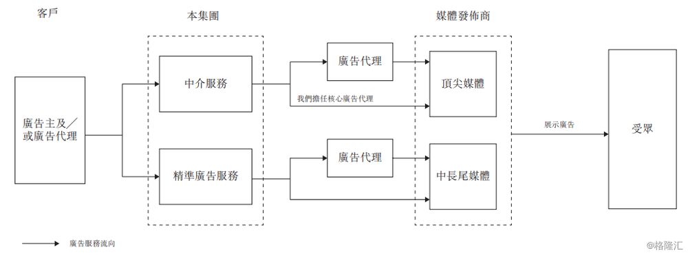 辉煌明天科技成立于2015年末,是移动广告服务商。移动广告是通过手机、平板电脑及其他移动设备进行投放的一种广告类型。根据招股书披露的盈利模式来看,辉煌明天科技是作为广告中介商,赚取上下游的价差。辉煌明天科技主要面对中国市场客户,对接并撮合广告服务供应商和广告主达成交易。下游广告主有广告的需求后,向公司进行委托,公司会评估客户需求,并通过数据分析制定计划及安排广告投放,从上游广告商采购流量,为下游广告主投放广告。