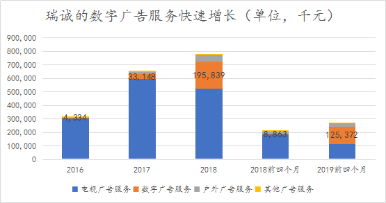 而在数字广告服务方面,瑞诚不断取得突破,在连续强劲增长后,2019年前4个月数字广告的收入占比达到了46.7%,已经超过了电视广告业务收入占比43.7%,成为第一大收入贡献。