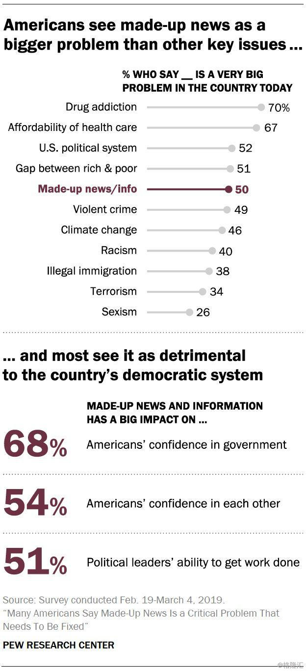 十年来,假新闻和谣言引发人们越来越多的关注。对于美国而言,2016 年的美国总统大选是假新闻和谣言引发人们担忧的里程碑事件。据 2019 年的一项调查,50% 的美国人认为假新闻和谣言是一个重大议题,其紧迫程度要大于恐怖主义、非法移民、性别歧视和种族主义。68% 的美国人认为虚假新闻影响了美国人对政府机构的信心。