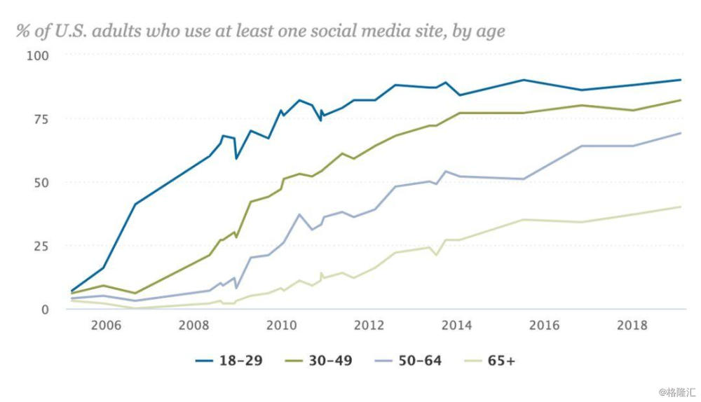 图 | 美国人各个年龄段使用社交媒体的比例趋势。