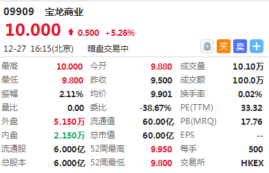 华盛资讯12月27日讯,今日下午宝龙商业,贵州银行有暗盘交易,宝龙商业暗盘高开4%,截止16:16,报价10.00港元,较发行价涨5.26%,成交额100万港元,最新总市值60亿港元。