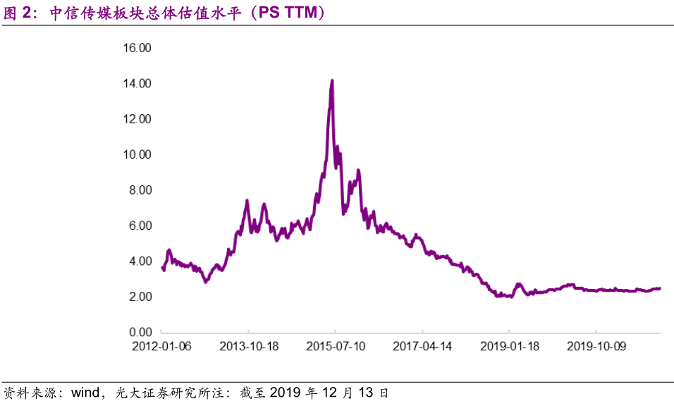 以2015年为节点,由于市场开始消化前期传媒大发展中带来的多面影响,如电视广告投放量下降、传统报纸销量下滑、杂志期刊的停刊等,传媒行业的估值逐步下移。目前行业市销率仅为 2.41X,位于历史 9.77%分位点。