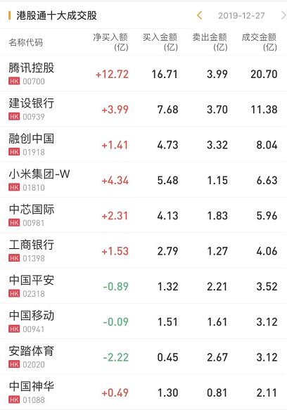 港股通今日净流入港股37.59亿港元。具体看,今日净买入腾讯控股12.72亿港元,净买入小米集团4.34亿港元,净买入建设银行3.99亿港元。