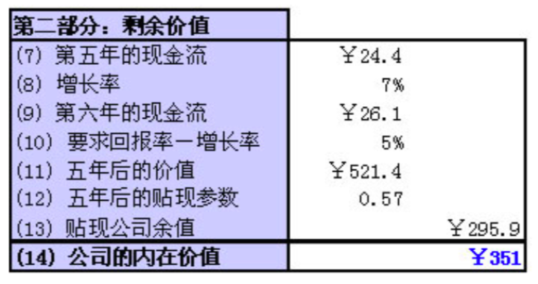 第二部份则是集中计算折算为现金值的公司未来五年后的剩余价值。首先,假设公司经过五年达16%的高速增长,现金流的增长幅度会由16%下调至每年7%,因此公司未来的第六年现金流则为26.1元 (24.4 X 1.07),而假设公司其后的现金流保持每年以7%稳步上升,并同时假定所要求的回报为每年12%(贴现率),公司剩余价值则可以凭此推算为521.4元(26.1/(12%-7%))。然后,再将公司五年后的未来余值折算为现值(Present value),即295 元(521.4 X 0.57),便可估算出折算为现金值的公司未来五年后的剩余价值。