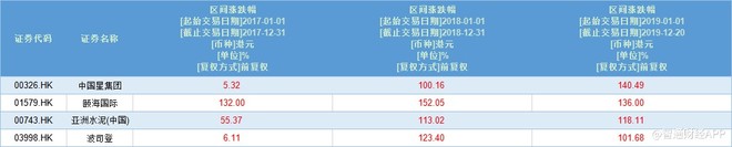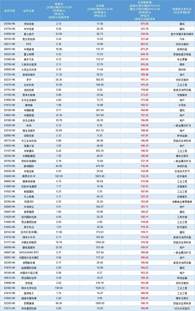附截至2019年12月20日,累计涨幅超过100%的港股主板名单,具体如下: