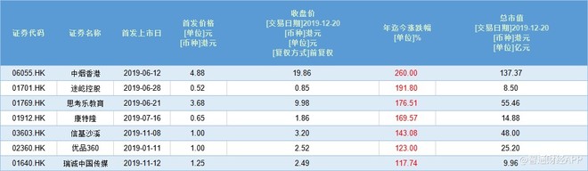 即便新股表现乏善可陈,但仍有个股实现翻倍。据智通财经APP统计,剔除创业板个股,今年以来,中烟香港(06055)、途屹控股(01701)、思考乐教育(01769)、康特隆(01912)、信基沙溪(03603)、优品360(02360)、瑞诚中国传媒(01640)7只新股累计涨幅超过100%。其中明星股中烟香港累计涨幅高达260%。