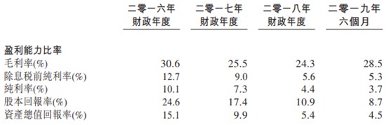 于2016年-2018年以及2019年六个月,公司的毛利率分别是30.6%、25.5%、24.3%、28.5%;纯利率为10.1%、7.3%、4.4%和3.7%。