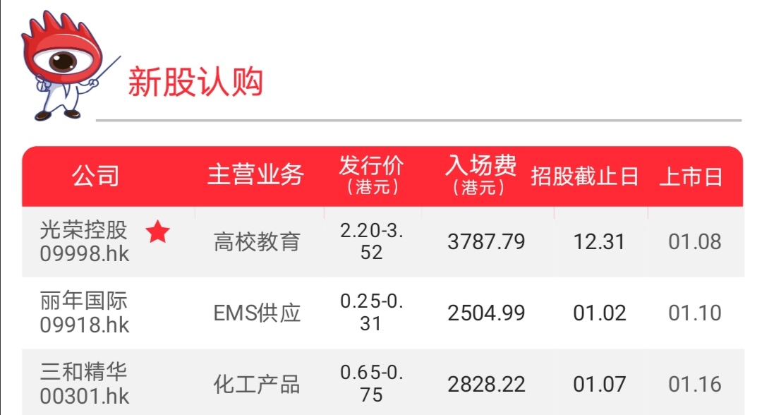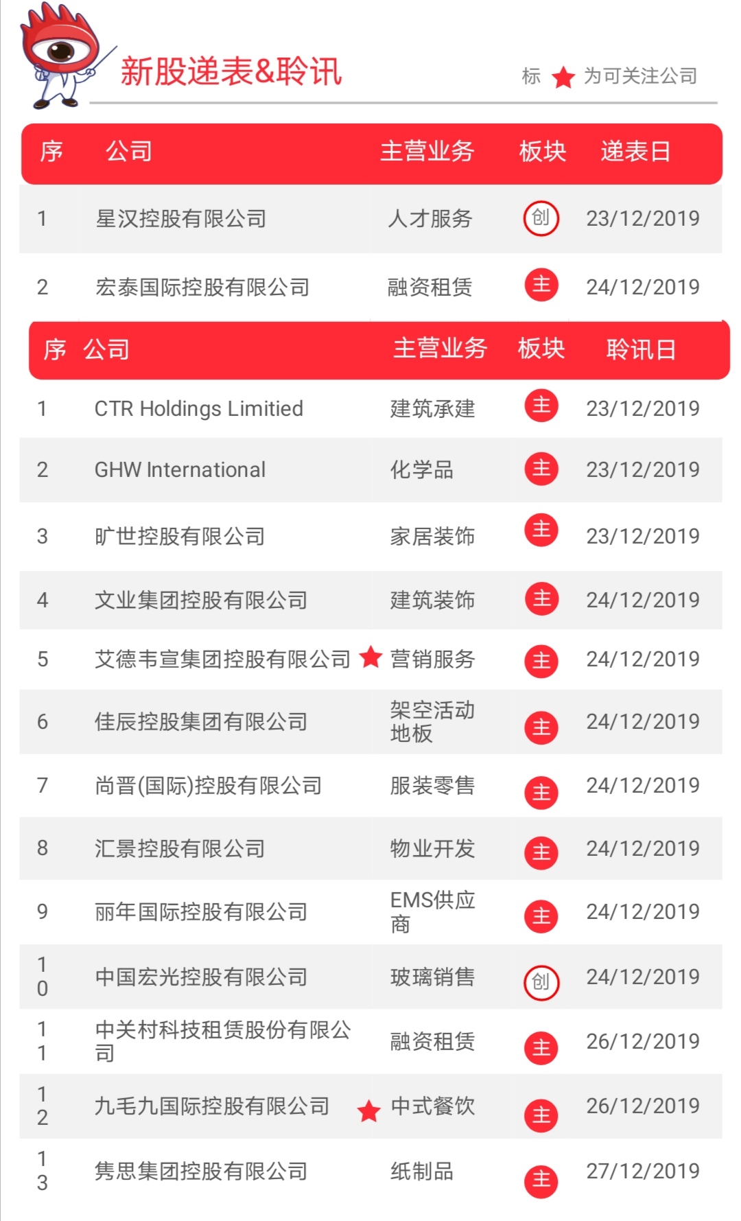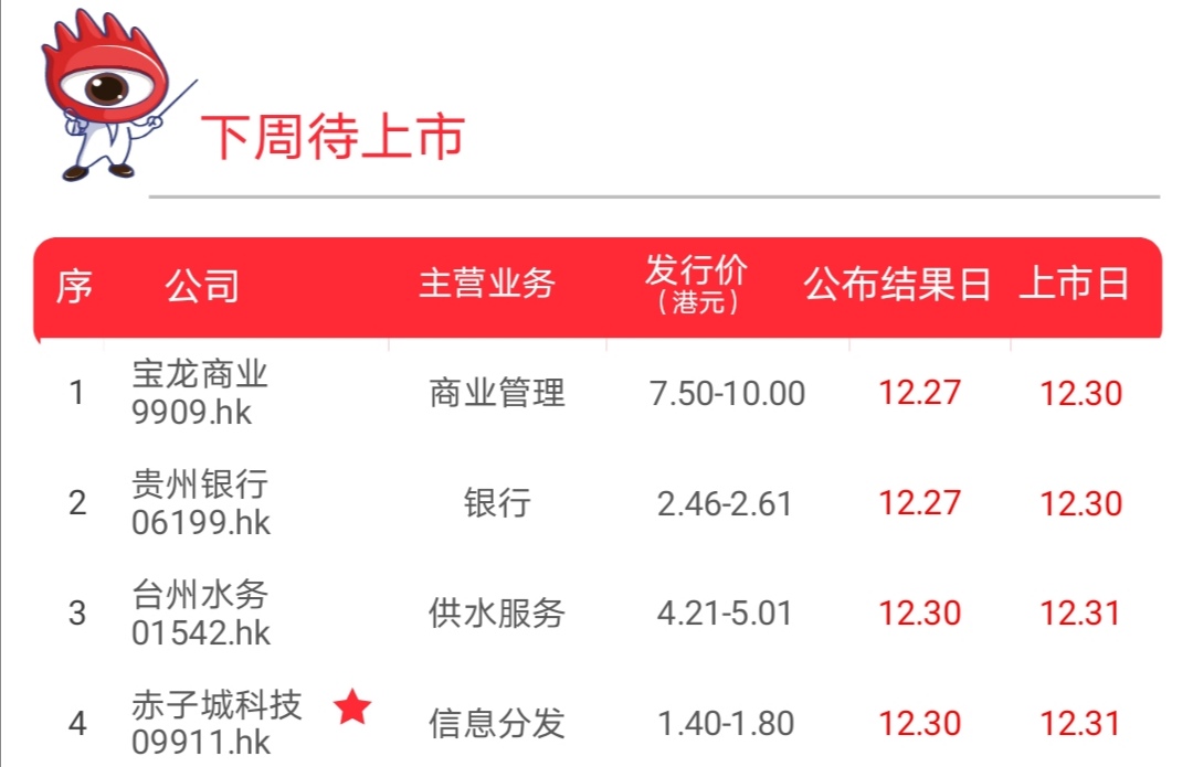 下周有4只新股挂牌,周二即2019 年最后一天将迎来年度“超购王”赤子城科技的上市,该公司主要通过第三方内容开发在海外获得流量,并与广告平台合作进行流量变现,月活用户近1亿。大幅超购原因主要是定价仅为1.4-1.8港元,最高市盈率约12.8倍,与同行上市公司近40倍的动态市盈率相比,具有较大想象空间。