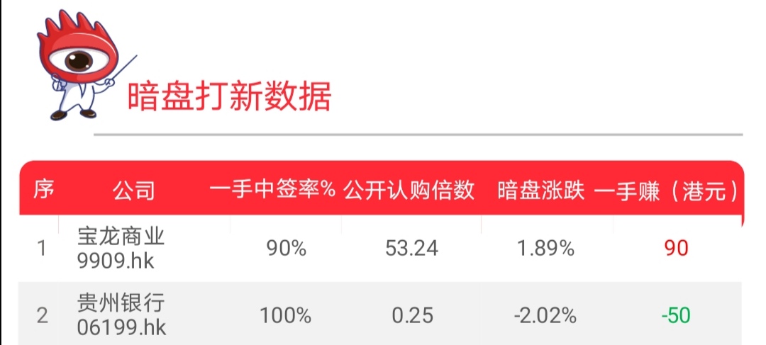 本周五有2只新股的暗盘交易。2只新股皆有农银国际作为保荐人,其中宝龙商业暗盘表现差强人意,盘初涨幅一度超7%,后涨幅缩窄至1.89%,若收盘卖出不计手续费,一手收益90港元。贵州银行表现不佳,该股此前公开发售认购不足,暗盘行情或受其影响。