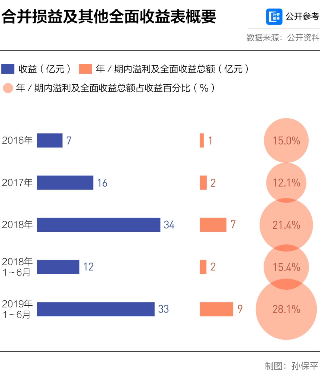 根据其招股书显示,从2016年至2018年,其收益分别为7.07亿元、15.65亿元、34.34亿元,每年都在以超过100%的速度增长。到今年上半年,仍然保持着同比增长超过1倍的表现。