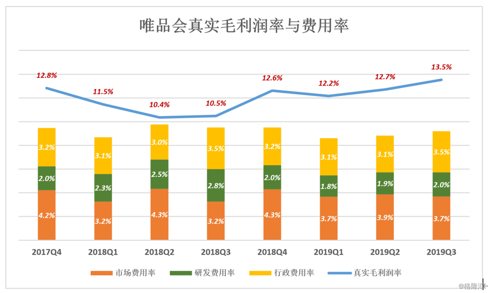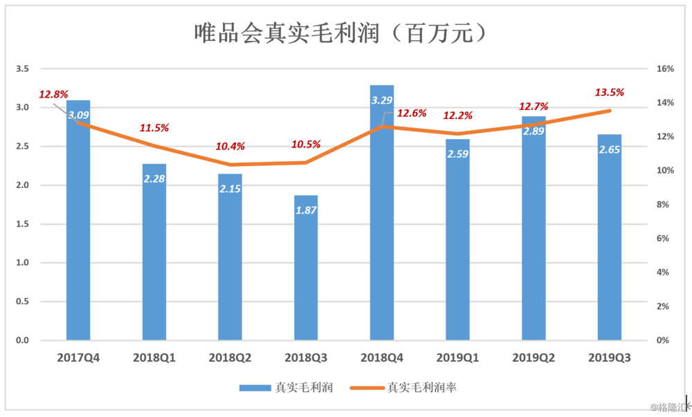 但剔除履约成本后,唯品会真实毛利润率仍在10%以上。2019年Q3,真实毛利润及毛利润率分别为26.5亿和13.5%。京东在开放平台业务大幅拉高毛利润并且不计物流成本的情况下,毛利润率也只不过是这个水平。