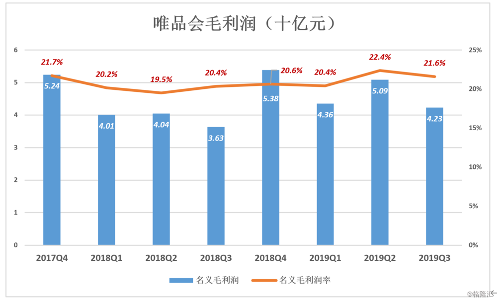 由于品类的缘故,唯品会毛利润率远高于京东自营。2019年Q3毛利润42.3亿,毛利润率21.6%。