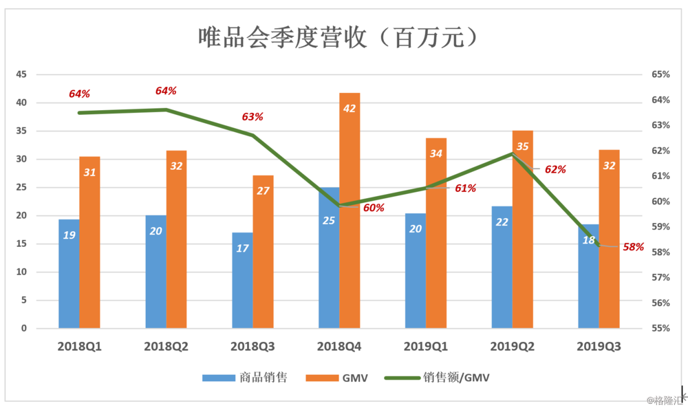 以唯品会各季商品销售收入做分子、GMV做分母,算出过往7个季度的成交率在58%~64%之间。2019年Q3,商品销售收入和GMV分别为184.8亿和317亿,成交率58.3%。#GMV有四成是水#