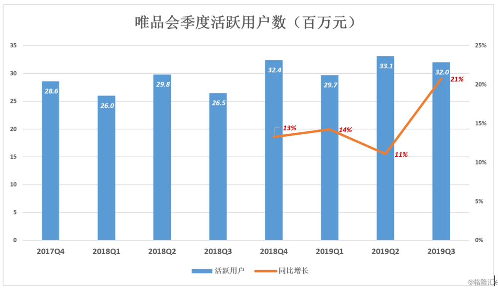 与阿里、京东相似,唯品会营收的主要推动力是活跃用户增长。