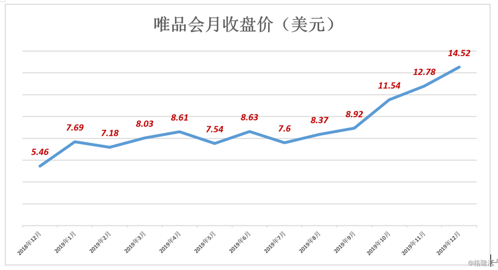 2019年12月27日,唯品会股价收于14.52美元,较年初上涨165.9%,市值逼近100亿美元。