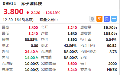 华盛资讯12月30日讯,赤子城科技暗盘高开92.85%,截止16:16,报价3.8港元,较发行价涨126.19%,成交额135万港元,最新总市值38亿港元。