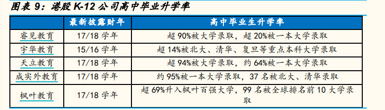 从上市 K12 学校高中毕业生升学率来看,也十分有竞争力, 民办学校的上市 K12 学校均为优质资产,本身办学品牌力强,学生筛选机制和课程设置灵活度高。根据公司年报还有国金证券研究所的数据,学生经过完善体系培养后,整体高中毕业生升学率(本科)超 90%,且其中有很大比例被重点一本院校录取,而 2018 年全国高考人数 956 万人,招生人数 422 万人,全国高考本科录取率仅为 44%,远低于上市 K12 学校升学率水平。