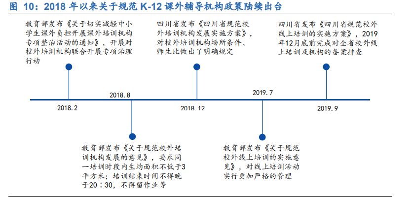 教育行业经过 2018年“810”《民促法(送审稿)》事件之后整体表现低迷, 其中的核心条款包括—1.实施集团化办学的,不得通过兼并收购、加盟连锁、协议控制等方式控制非营利性民办学校。2.公办学校举办或者参与举办非营利性民办学校的,不得以品牌输出方式获得收益等。K12课外辅导机构也在2018年频频遭遇政策限制。