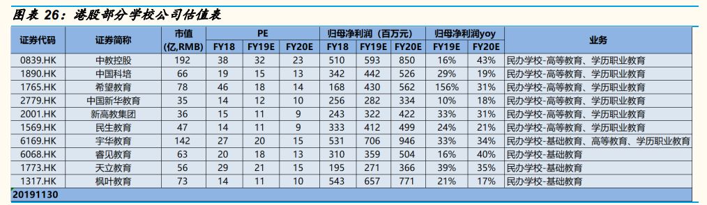 经过多年的精细经营和资源整合,高校上市公司,已经形成了较高的进入壁垒,并且具备良好的运营模式和现金流,拥有持续增长的潜力和确定性,是非常优质的资产。但因为政策一直悬而未决带来的悲观情绪,使得这些优质资产现在处于较为低估的状态。目前学校公司对应 2019 财年的平均 PE 估值在 17x左右, 部分较低的已经到 11x左右,但这些民办高校都保持比较高的利润增速,比较良好的现金流。因政策情绪导致的优质资产低估在教育行业正上演。