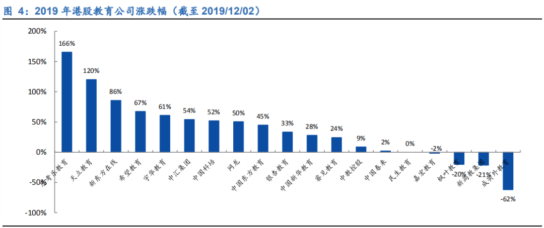 2019年港股的思考乐教育和天立教育都有翻倍涨幅。总体来看,港股上市公司以学历教育为主,包括 K12 学历教育(枫叶教育、睿见教育等)和高等学历教育(中教控股、民生教育等);此外,还有职业技能教育龙头中国东方教育,K12 课外辅导新东方在线、思考乐教育。教育行业的细分行业随着发展,越来越多并且分工具体。