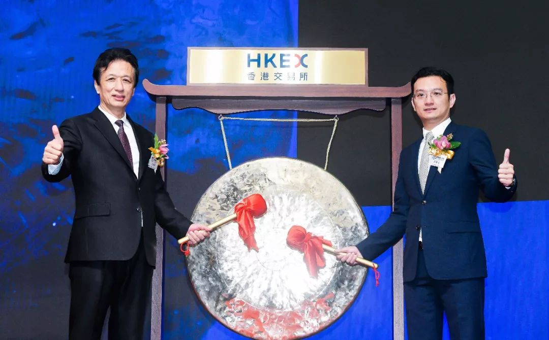 今天上市,宝龙地产董事局主席许健康、总裁许华芳上台敲锣。